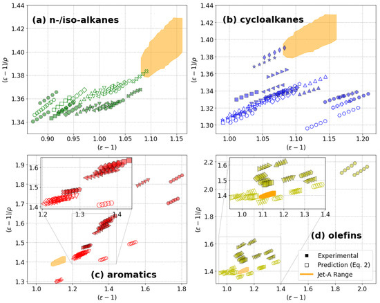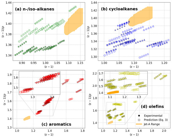 Clausius–Mossotti plots containing experimental results (closed symbols) and predictions from the Clausius–Mossotti relation shown in Equation (2) (open symbols). Each subplot (and color) focuses on one general hydrocarbon class: n-/iso-alkanes (a), cycloalkanes (b), aromatics (c), olefins, and alkynes (d). Each molecule is identified by a unique shape. The Jet-A experience range, based on ARINC and CRC historical data, is shown in orange.