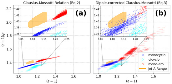 Clausius–Mossotti plot displaying predictions from (a) the Clausius–Mossotti relation (Equation (2)) and (b) the dipole-corrected model (Equation (3)) for the NIST database molecules of interest for blending with current SPK products (monocycloalkanes, dicycloalkanes, and mono-aromatics). The Jet-A range is shown in orange as a reference point.