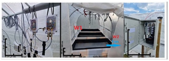 The tunnel was equipped with a proprietary system for measuring and controlling solar drying parameters (Figure 1). An individual sensor suite was provided for each station, measuring air humidity (10–100%, ±3% RH), pressure (300–1110 hPa ± 1 hPa), temperature (−40–85, ±1 °C), insolation (0–1280 ± 10 W/m2), moisture and mixture temperature. (0–100% ± <2%; −10–85, ±0.5 °C). In addition, a separate suite was installed in the power supply unit to monitor external atmospheric conditions. Data was recorded continuously in the cloud. To ensure the highest possible temperature and air circulation inside the tunnel, two (opposite) windows out of 6 were left open, marked as W1 and W2 (Figure 1). Additionally, an electric fan was installed in window W2, which pushed air out of the tunnel, aiding the internal air circulation.