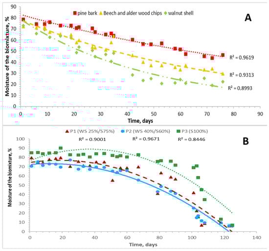 In a preliminary series of tests, it was found that in the time it took for the mixture of sludge and nut walnut shells to reach a moisture content of 20%, the mixture with woodchips reached 30% moisture content, and that with bark reached 45% (Figure 2A). Due to the mixture structure and drying time in the initial test series, walnut shells were chosen as an additive in the basic series.