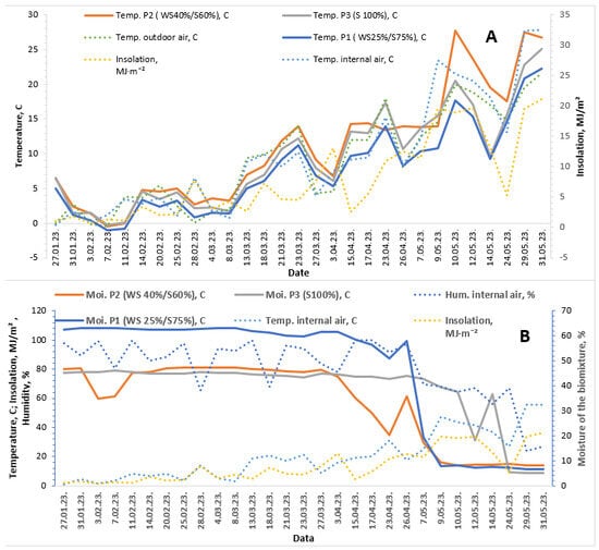 The basic test series in winter and spring was characterised by uniform changes which occurred in the technological parameters of the mixture, depending on the duration of the tests, indicating an improvement in the recorded parameters along with changes in weather conditions, which significantly differed from those in the final phase of the experiment. The solar drying process at outdoor temperatures below or close to 0 °C was less effective than in temperatures above 0 °C. The analysis of the impact resulting from the amount of sludge bioadditive shows an improvement in the ability to maintain higher temperatures when more nut shells are used (40%—P2 mix). Figure 3B shows the change in the biomixture moisture content relative to external parameters.