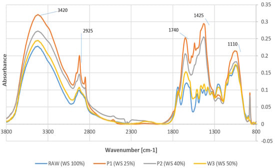 The amount of ethanol-extractable compounds ranged widely from 2.71% [] to 4.6% []. The amount of ethanol-soluble substances changed significantly during the experiment. It decreased from 1.70% to 1.14% (Table 4), which also indicates the onset of changes in the main compound structure. Further, the change in the amount of pentosans—short-chain compounds—reaching as much as 5% confirms the beginning of these changes.
