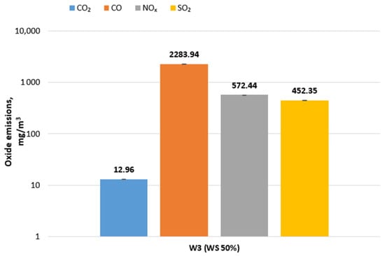 Figure 5 presents the values of oxides of carbon, nitrogen, and sulphur gases. In accordance with the current EU directives on emission standards for biomass combustion, only the values of nitrogen oxides were exceeded. These values are caused by the addition of sewage sludge in the mixture.