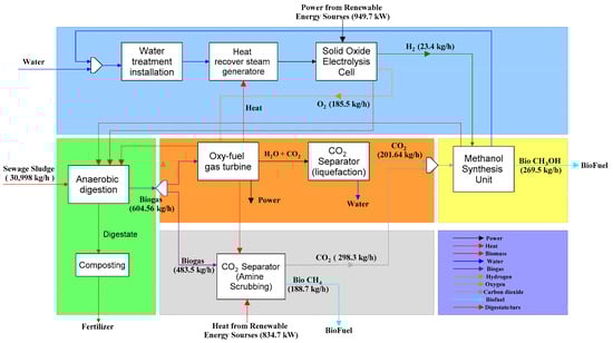 Sewage sludge serves as the primary feed material for the anaerobic digestion system. A portion of the biogas generated is sent to the oxy-fuel combustion system, which sources its oxygen from the high-temperature solid oxide electrolysis system. Meanwhile, another part of the biogas is diverted to the biogas upgrading system, where methane and carbon dioxide are produced. The carbon dioxide from the biogas upgrading system, oxy-fuel gas turbine system, and the hydrogen from the solid oxide electrolysis unit are then transferred to the methanol synthesis unit, facilitating methanol production in a more efficient manner.