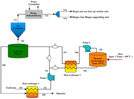 As depicted in Figure 2, the anaerobic digestion subsystem process starts with the municipal sewage sludge as feedstock, which undergoes heat exchange and is pumped to elevate its temperature and pressure before entering the thermal pretreatment tank. The pretreatment tank, operating at 90 °C, has its heat demand satisfied by energy recovered from HX2, HX4 of the oxy-fuel gas turbine and O2-HX, H2-HX of the SOEC. This temperature is selected based on studies, including Mirmasoumi et al. [], which demonstrated that thermal pretreatment at 90 °C for 0.5 h can significantly enhance the biodegradability of sewage sludge, leading to a 59.82% increase in biomethane productivity compared to non-treated sludge under mesophilic conditions. Additionally, the pretreatment process and the increase in digestion temperature to thermophilic conditions have been shown to boost biomethane productivity by up to 160.8%. This approach not only enhances biogas yield but also improves the overall efficiency and energy recovery of the anaerobic digestion process. The feedstock’s pressure is increased to 3.5 bar to ensure efficient entry into the digesters. Biogas produced at 1.5 bar and 55 °C under thermophilic conditions is purified and dehumidified to remove hydrogen sulfide and water vapor, and this action causes its temperature to drop to 19 °C; subsequently, 20% of the biogas is directed to the oxy-fuel gas turbine unit, while the remaining portion enters the biogas upgrading unit. Table A1 of Appendix A provides the elemental analysis of the organic components in sewage sludge, while Table A2 of Appendix A presents the parameters and operating conditions for the thermophilic anaerobic digestion of the sewage sludge. These tables summarize the assumptions, inputs, and outputs used in our thermodynamic modeling. The technical data of the anaerobic digestion plant in Tabriz, including details such as the dry matter content of sludge, specific biogas yield, methane content, and operational temperatures, are comprehensively provided in these tables, ensuring that all relevant information is available for review.