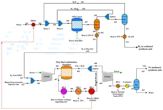 The Energy Union strategy of the European Commission aims for net-zero greenhouse gas emissions by 2050 []. To achieve this, there is a growing reliance on renewable energy sources (RES) like wind and solar, which generate power intermittently, depending on factors like weather and sunlight [,]. To stabilize energy output and expand renewable energy use, energy storage solutions are crucial. One method is converting energy from renewables into hydrogen through electrolysis, which can then be used to produce biofuels [,]. This study explores a methanol production system utilizing high-temperature electrolysis and anaerobic digestion.