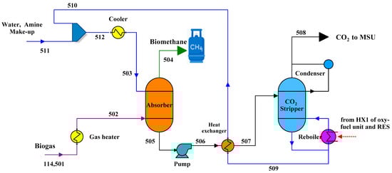 Amine scrubbing is a method used to remove unwanted gases from a gas mixture by employing a liquid amine solution, which absorbs the target gas molecules. This absorption process is influenced by the solubility of the gas in the amine solution and its chemical affinity for the amine. The technique involves a sequence of chemical interactions between the amine and gases such as CO2, resulting in the formation of new bonds. Various amines, such as MDEA, DEA, DGA, and MEA, are commonly utilized for this purpose. This method can produce high-purity methane (94–98%), but it requires significant heat to regenerate the amine solution []. Figure 4 illustrates the process layout modeled in Aspen Plus.