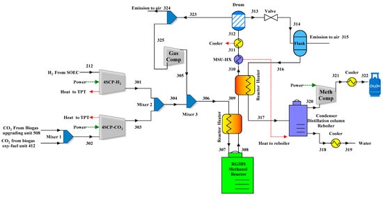In the methanol synthesis subsystem, shown in Figure 5, three streams are combined to produce methanol through CO2 hydrogenation. These streams consist of hydrogen from the Solid Oxide Electrolysis Cell, CO2 from the biogas upgrading unit, and CO2 from the oxy-fuel gas turbine. All streams are compressed and mixed using four-stage compressors. In addition, the streams are blended with recycled gases before being fed into the methanol reactor and its associated heater.