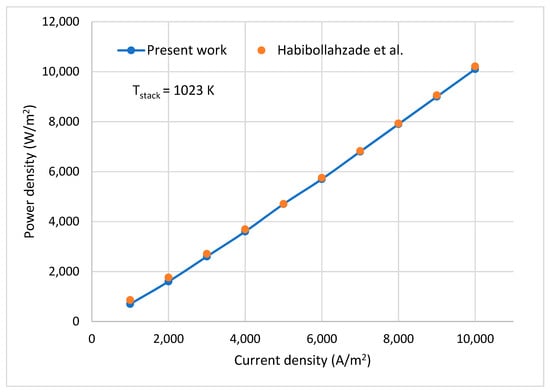 The model developed for this study was validated using data from existing literature. The validation results of the methanol synthesis unit have been shown in the previous reference work []. Figure 6 demonstrates the validation of the SOEC stack model through comparison with the results from Ref. []. Table 2 verifies the results of the temperature, pressure, mass flow rate, and composition of important streams by comparing them with Ref. []. The results indicate a strong agreement between this study and the referenced works.