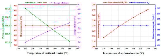 Figure 7 illustrates the impact of the methanol reactor temperature on the energy efficiency, power and heat consumption, and the capacities for biomethane and biomethanol production. Figure 7 indicates that as the reactor temperature is increased from 220 °C to 280 °C, the rate of methanol production in the reactor increases due to the chemical reactions occurring. This increase enhances methanol output in the production system. Additionally, the results show that elevating the reactor temperature indirectly lowers the flow rate of gas through the CP3 compressor, which in turn reduces power consumption—evidenced by the descending trend in the power consumption graph. Consequently, the reactor temperature appears not to be affected by the biogas upgrading unit, resulting in steady heat consumption and methane production capacity. Ultimately, with a significant increase in methanol production and a decrease in the power consumption of the entire system, the energy efficiency of the system increases significantly.