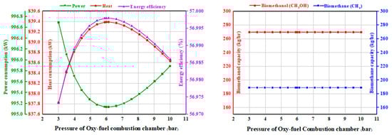 Figure 8 illustrates the impact of the pressure of the oxy-fuel combustion chamber unit (PCC) on the energy efficiency, power and heat consumption, and the capacities for biomethane and biomethanol production. According to the figure shown, with an increase in PCC, a maximum efficiency point appears. This fact can be explained by the observation that as PCC increases from 3 to 6 bar, the power generated by the turbine in the oxy-fuel gas turbine unit outweighs the power consumed by the compressor in the same unit, leading to an increase in the power output of the oxy-fuel gas turbine unit. However, when PCC increases from 6 to 10 bar, the opposite scenario occurs. This is why the total system power consumption has a minimum point at approximately 6 bar pressure. Conversely, the total system heat consumption behaves in the opposite manner. It should be noted that the impact of the system’s power consumption on the energy efficiency is greater than that of the total system heat consumption; therefore, the maximum efficiency point occurs at about 6 bar pressure.