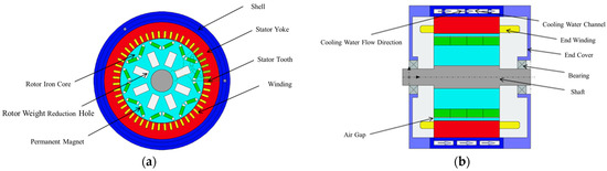 The permanent magnet synchronous motor (PMSM) has attracted widespread attention due to its advantages of low vibration noise, good torque stability, high control accuracy, and high torque density [1,2]. The permanent magnet is easily affected by temperature. In order to ensure the stability and service life of the permanent magnet synchronous motor, it is necessary to cool the motor efficiently. The cooling methods of the motor mainly include air cooling, water cooling, and oil cooling, among which water cooling is widely used [3]. It is necessary to study the thermal characteristics of water-cooled permanent magnet synchronous motors.