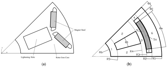 Each pole of the motor rotor (each pole accounts for a 45° central angle) is installed inside the rotor by two pairs of magnetic strips, and there is a weight-reducing hole on each pole rotor. Figure 1 shows the radial and axial structure of the motor.