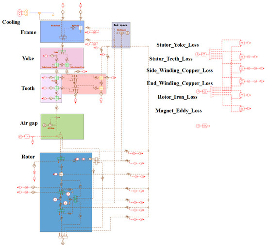 The LPTN represents the components of the motor with lumped parameters such as interconnected thermal resistance and thermal capacitance [32], which make the model simpler and faster. The disadvantage is that the temperature distribution of any point of the motor cannot be obtained. Some studies have simplified the LPTN model, highlighting the simple and fast advantages of the LPTN model, but the verification conditions used are relatively simple and different from the actual conditions [33,34]. With its fast and reliable characteristics, the LPTN model can also be coupled with electromagnetic field simulation to improve the simulation accuracy of the temperature field and electromagnetic field [35,36].