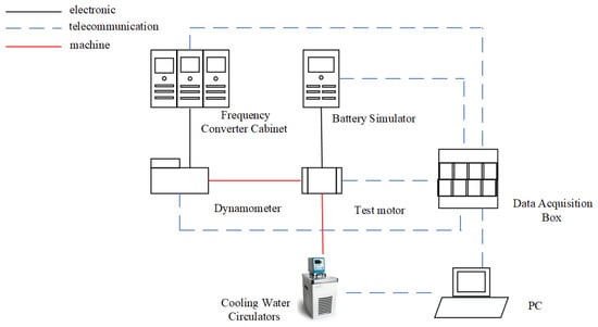 Figure 7 displays the diagram of the motor test bench. During the test, the dynamometer was maintained at a constant speed mode according to test conditions, the dynamometer was powered by the frequency converter cabinet, the motor was powered by the battery simulator, and the motor-cooling water was provided by the cooling-water circulators. The data-acquisition box collected parameters such as motor torque, speed, thermocouple sensor temperature, bus voltage, inverter cabinet voltage, battery simulator power, voltage and current, dynamometer speed and torque, and power. And there were 11 thermocouples arranged to measure the temperature of the motor end windings and magnets.