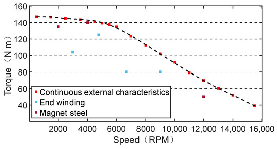 The test conditions were selected according to the continuous external characteristics of the motor. Figure 8 shows the distribution of the test conditions of the motor. For the stator, in-slot windings, and end windings, the highest temperatures generally occurred at the end windings due to the heat dissipation path. In addition, when the motor was running at low speed and high torque, the winding current was higher and the loss was higher. When the motor was running at a high speed in the constant power region, the core losses were higher. Therefore, when selecting the test conditions for the end winding, according to the maximum external characteristic curve of the motor, take the rated speed as the reference, select two low-speed and high-torque working conditions on its left side, and select two constant power and high-speed working conditions on its right side. The experiment was completed by using a type K thermocouple to measure the temperature of the end winding, and the measured temperature results were collected and analyzed by a data-acquisition system. The accuracy of temperature measurement is ±(0.05% rdg. +0.5 °C), and the digital display resolution of the temperature measuring instruments is 0.01 °C. During the test measurement, two temperature sensors were firstly arranged at the two neutral points of the end winding, and then five temperature sensors were evenly arranged on the surface of the end winding to measure the temperature. The test points of the end winding are shown in Table 5.