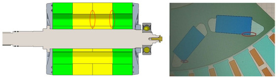 The temperature of the magnet steel is generally slightly lower than the rotor temperature near the air gap. In this paper, the temperature of the thermal model rotor is verified by the temperature of the magnet steel. Two low-speed and high-torque conditions points were selected on the left side of the rated speed, and a constant power and high-speed conditions point was selected on the right side of the rated speed. During the rotor magnet temperature measurement test, the temperature sensor arrangement was as shown in Figure 9. Temperature sensors were arranged in the third and fourth layers of the magnet to measure the temperature of the magnet at three operating points. The thermocouple wires were introduced through wire holes drilled in the rotor laminations, to the motor rotor shaft, glued to the walls of the rotor shaft cavity, through the hollow rotor shaft of the motor, and finally connected to the temperature data acquisition card. The thermocouple sampling frequency was one temperature value per second. The experimental conditions of magnet steel are shown in Table 6.