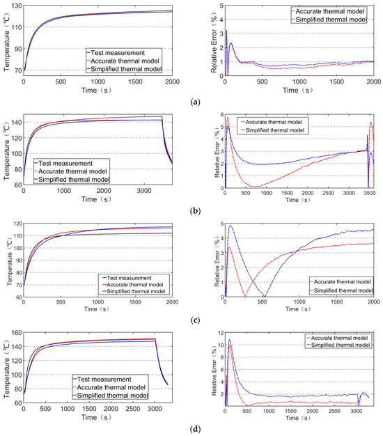 It can be seen from Figure 10 that for the test point 1 of the end winding, the simulated temperature-rise curve and the experimental curve of the two thermal models have good following performance when the break point is ignored, and the errors of the two models are very close. For test point 2, the error of the accurate thermal model is smaller in the temperature-rise stage, and the accuracy of the simplified thermal model is higher in the motor-cooling process. At test point 3, the simulation accuracy of the accurate thermal model is higher, but the error of the simplified thermal model is still less than 5%. Under the condition of test point 4, the temperature-rise curve error of the simplified thermal model is larger, and the error is basically about 2%, which is 50% higher than the maximum absolute error of the accurate thermal model.