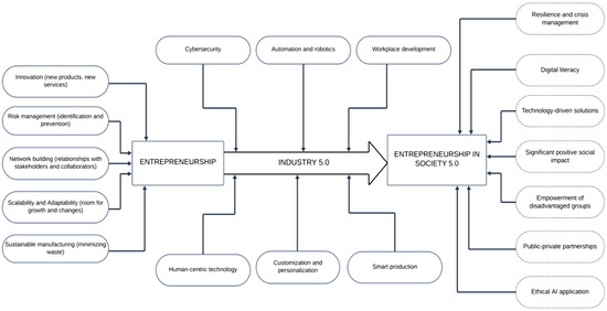 In particular, the concept of robotization in Industry 5.0—“Automation 5.0” is not aimed at creating machines that can replace people, but at achieving creative interaction and collaboration between people and machines []. When applied to the development of entrepreneurship in Society 5.0, the collaboration of people and machines will balance new technologies with personalized production methods, creating a more holistic industrial ecosystem (Figure 2). Entrepreneurs in Industry 5.0 are shaping the integration of communication between people and advanced digital technologies (the transition from cyber-physical to cyber-social systems) [].