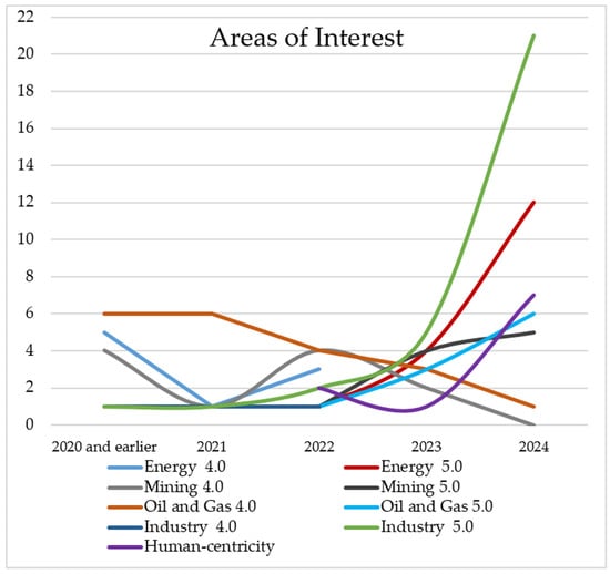 As can be seen in Figure 4, since 2022, there has been a sharp increase in the interest of researchers in the problems of Industry 5.0 expansion in general and a weakening of attention to Industry 4.0 as the starting point of the transition to it. A similar picture is observed for Industry 5.0 platforms in the extractive sector—Mining 5.0 and Oil and Gas 5.0, the growth of interest in which is associated with weakening interest in Mining 4.0 and Oil and Gas 4.0. As for the analysis of issues of human-centricity as a key property of Industry 5.0 and its platforms in the mineral resource sector, the interest in it is quite new and can clearly be traced since 2022. Therefore, the development of research and publication activity in these areas should become a guarantee for the establishment of research on the transition to Energy 5.0 on a scientific basis in the context of achieving the sustainable development goals.
