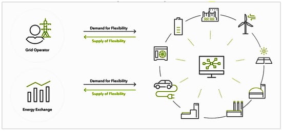In close connection with the energy storage systems of the future, an important trend in the transition to Energy 5.0 is the use of virtual power plants—a network of decentralized power units, adaptable power consumers, and storage devices that integrate sources of non-renewable energy (thermal power plants) and renewable—decentralized wind power plants, solar parks, and thermal power plants (Figure 9). It is expected that by 2028, the global market for virtual power plants will have reached USD 6.5 billion [].