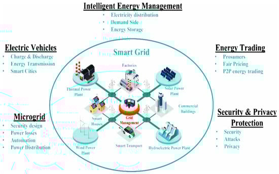 Blockchain technologies are recognized as ideal for energy audit and management, allowing to solve the main problem of the transition to Energy 5.0—cybersecurity and data loss. In addition, without an energy audit, it is impossible to assess the success of those unprecedented investments in Industry 5.0 technologies, which are necessary for the formation and development of human-centric cyber systems in the energy sector []. The integration of blockchain technologies and distributed registry methods is seen as an attempt to improve the management of the “Smart Grid” through the transition to a policy of trust management and the complete decentralization of peripheral power consumption infrastructure, for example, charging electric vehicles []. The roadmap for the development of Smart Grids based on blockchain is given in Figure 11.