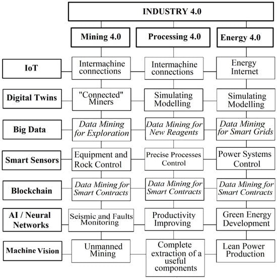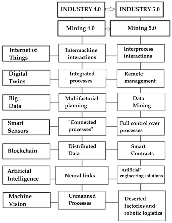 In relation to Mining 5.0 as an integral component of Industry 5.0, its end-to-end technologies (transforming the entire industry) are self-educating collaborative robots, Data Mining by machines, ubiquitous machine learning, and the integration of the physical and virtual world into Big Data. In turn, the innovative technologies of Mining 5.0 as such include digital twins based on Data Mining, smart contracts in the raw materials market powered by neural links, the replacement of people by collaborative robots in mines and quarries, artificial intelligence, and machine learning. The global nature of the diffusion of data from innovative components of geotechnology suggests the support of artificial intelligence in the analysis of Big Data from a variety of “smart sensors” and Data Mining when making engineering and management decisions []. Accelerating the transition to Green Mining involves the use of artificial intelligence to analyze Big Data in the field of intensity of raw materials and energy consumption by all industries []. Further, machine learning of collaborative robots will make people completely free from working underground and from dangerous and harmful areas of open-pit mining [], which is fully consistent with the human-oriented production of Mining 5.0, with the priority of protecting health and restoring damaged areas []. The very development of research in the field of convergence of mining, digital, lean, and circular technologies of Industry 5.0 takes the form of a “Triple and Quadruple Helix” of innovative cooperation between power and minerals producers, universities, government, and local communities [].