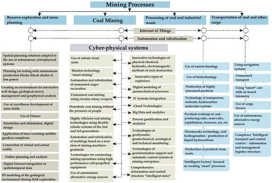 In the process of transition to Energy 5.0 with its human- and nature-centricity, the role of fossil energy sources is changing already at the level of supplying resources for power production, the chains of which become “smart” [] and widely include closed-loop production systems connected to marketing strategies []. When examined in more detail, cyber-physical human-centric technologies in “Mining 5.0” have deep intellectualization and cover all industries that extract minerals, including the Internet of Everything. As a result, the fossil fuel sector is becoming a driver rather than a brake on the transition to Energy 5.0. The diffusion of human-centric technologies of Industry 5.0 in Mining 5.0 is shown in detail in Figure 15 [].