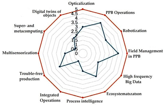 In turn, the transition to Mining 5.0 is intended to help resolve this contradiction in the process of introducing digital Computer Integrated Mining (CIM) systems—connecting digital systems for planning and managing the processes of open-pit and underground mining, enrichment of mineral raw materials, especially fossil energy resources, ensuring environmental safety, into unified IT systems of mining enterprises and the industry as a whole, in which there will be no “gray” areas of digitalization, and information about the current need for the extraction of fossil energy resources will be analyzed in real time []. In other words, the transition to Mining 5.0 is determined both by the needs of society in achieving the above sustainable development goals (a criterion for a human-centric economy), but also by the high digital maturity of mining enterprises. Digital maturity is the degree of involvement of an individual enterprise and an entire industry in the process of saturation with end-to-end digital technologies. Using the example of the diffusion of Industry 4.0 technologies, we can trace the penetration of digital end-to-end technologies into the extraction of energy resources and the production of energy from non-renewable sources (Figure 13).