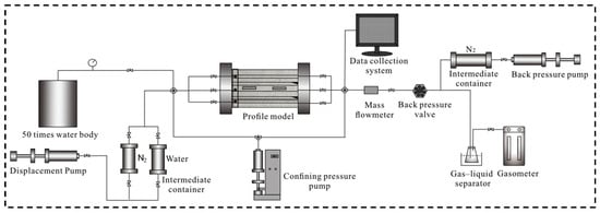 This study presents a novel high-temperature and high-pressure heterogeneous water intrusion profile model [42], measuring 100 cm × 30 cm × 1 cm (3000 cm2), making it the largest known two-dimensional model to date, effectively simulating the profile heterogeneity of the X gas reservoir. The movement of reservoir fluids under reservoir temperature and pressure conditions is more representative of actual seepage states. Additionally, if the pressure is too low, crude oil will degas at low pressure, which means that only simulated oil can be used when modeling reservoirs, rather than formation crude oil. This model has a maximum pressure capacity of 70 MPa and can withstand temperatures up to 150 °C, meeting the temperature and pressure simulation requirements of most oil and gas reservoirs, which is difficult for other models to achieve. Currently, the model is equipped with 456 uniformly distributed fluid saturation testing points arranged in a 38 × 12 configuration, essentially achieving full coverage of the profile model. Furthermore, since the saturation testing probes are densely arrayed on the surface of the profile model rather than embedded within it, they do not interfere with fluid seepage, allowing for more accurate monitoring of gas–water saturation conditions across the entire profile model. Compared to other models, this model overcomes the limitations of low accuracy caused by small pressure capacity and insufficient saturation monitoring points. To mitigate the impact of gas–water gravity differentiation during water invasion and prevent the edge water from only contacting the lower part of the profile model or the liquid flowing downward at the production end, a long strip of metal mesh and a right-angle metal sheet were specifically designed for the model’s inlet and outlet, respectively. Moreover, an innovative equivalent profile model incorporating a “discontinuous interlayer” was developed based on the core physical property analysis data of the F layer in well X2 of the X gas reservoir. Subsequently, water invasion experiments were conducted under different gas production rates and degrees of gas layer perforation at the formation pressure of 37 MPa. The findings offer valuable theoretical and technical support for the efficient development of X gas reservoirs.