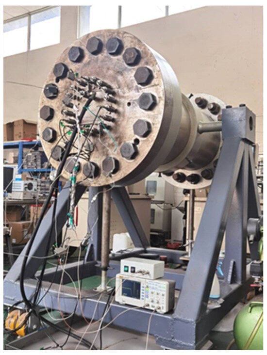 The experimental devices were independently designed and developed at our laboratory [42,43]. They primarily consist of a power high-pressure displacement pump; an intermediate container; a high-temperature, high-pressure plate model system (plate model, model frame, vertical lifting structure, temperature control system, fastening bolt, and resistance measurement component); a data acquisition system; a back pressure regulator; a gas–liquid separator; and a gas meter. The plate model is the pressure-bearing cavity used in the experiment. The experimental schematic and device are shown in Figure 1 and Figure 2.