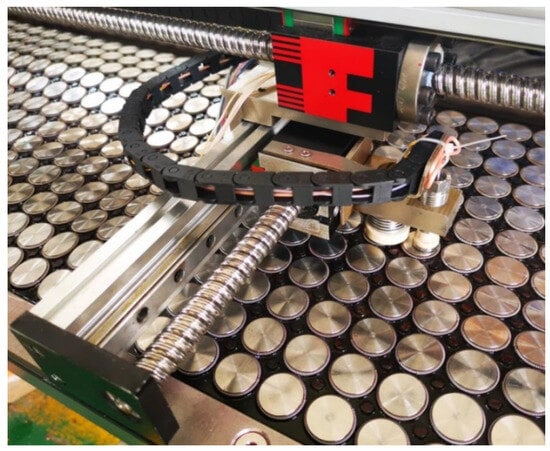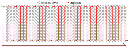 The temperature-controlled system consists of four heating tubes (providing the heat source), a temperature indicator (for real-time monitoring of the model temperature), and an insulation sleeve (wrapped around the exterior of the model to maintain a constant external temperature). The data acquisition system uses a temperature indicator and pressure sensor to collect temperature and pressure data during the experiment, and it also monitors changes in resistivity throughout the entire displacement process using the acoustic–electric emission probe and the acoustic–electric receiving probe (Figure 3). According to the principle of induction logging, when the induction coil in the acoustic–electric emission probe carries an alternating current, an alternating magnetic field is formed around the coil, and an induced current (eddy current) is generated in the rock plate. The secondary magnetic field caused by the eddy current causes a secondary induced current in the induction receiving coil. The acoustic–electric receiving probe can measure the resistivity at each test point’s position, from which the gas–water two-phase saturation data can be calculated using Equations (1)–(3) below, and these data are recorded on the computer. At the same time, the saturation diagram is generated to observe the movement of the gas–water interface in the profile [42]. The fluid saturation testing probe uses a serpentine walking pattern, as shown in Figure 4, which means it traverses each scanning point in the scanning area with the minimum number of movement steps.