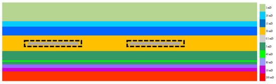 Permeability distribution of the profile model. (The permeability values range from 0.1 to 200 mD, exhibiting a significant level of heterogeneity. The area indicated by the dashed black line represents a 0.1 mD interlayer).