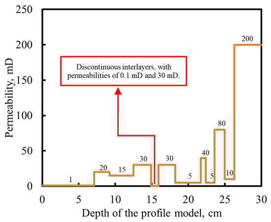 The focus of the innovative design of the two-dimensional profile model was also to design a low-permeability interlayer that is stretched but not completely isolated at 10–30 and 50–70 cm in the middle of the model (see the black dotted box in Figure 5, where the permeability is 0.1 mD). The interlayer will hinder the flow of gas–water fluid, but it is not completely sealed. The design of this “discontinuous interlayer” is a novel approach to understanding the effect of such actual interlayers on fluid transport distribution in thick gas layers in physical simulations. Based on the layer thickness of each small layer in the F layer, a profile model was proportionally scaled down to laboratory dimensions of 30 cm (height) × 100 cm (length) × 1 cm (width), with its permeability distribution shown in Figure 5 and detailed parameters listed in Table 1. By analyzing the permeability at various depths of the profile model, as shown in Figure 6, it can be observed that although the permeability distribution of the profile model is complex and variable, it generally exhibits a characteristic of positive rhythm.