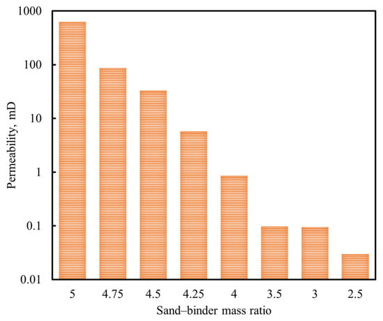 Relationship between the sand–binder ratio and core permeability. (The X axis is the mass ratio of quartz sand to binder, and the Y axis is the permeability value of the core drilled after the sand–binder mixture is dried).