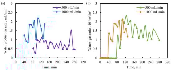 Variation in water production rate and water–gas ratio of gas wells when the gas production rate is 1000 mL/min. (a) Water production rate. (b) Water–gas ratio.