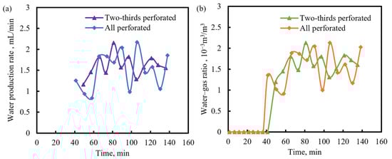 The water–gas ratio is the volume ratio of water to gas produced from the gas reservoir, which can assess the liquid production capacity of the reservoir and analyze the presence of formation water during gas production. When the water–gas ratio of the gas well exceeds 10−3 m3/m3, it is defined as the watered-out stage of the gas reservoir. Figure 10 and Figure 11 show the variations in water yield and water–gas ratio during the experiment. Because of the strong heterogeneity of the F layer in the X gas reservoir, there is a great variation in permeability in the reservoir, which leads to fluctuation in the water production rate of the gas well, and the variation in the water–gas ratio generally oscillates. Figure 10 shows that, when the gas layer is all perforated, the model operating at a gas production rate of 500 mL/min experiences a water breakthrough time of 76 min and a watered-out time of 83 min. In contrast, for the model with a gas production rate of 1000 mL/min, the water breakthrough time is reduced to 36 min, while the watered-out time is 41 min. Under the same degree of gas layer perforation, the greater the gas production rate, the faster the corresponding water production rate, and the greater the total water production. This occurs because the larger production rate will lead to a higher production pressure difference, advancing the gas well water breakthrough time. After the formation water breakthrough, the water–gas ratio rises abruptly, and the gas well quickly enters the watered-out state, which seriously affects the normal production of the gas reservoir. Therefore, when formulating a reasonable gas production rate, it is also necessary to consider the drainage difficulty after the on-site water is produced to avoid construction difficulties.