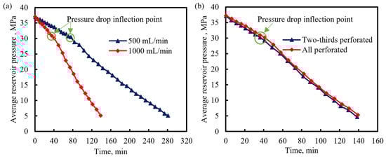 Variation in the average formation pressure. (a) Variation in the average formation pressure of gas wells at gas production rates of 500 and 1000 mL/min, with the gas layer being all perforated. (b) Average formation pressure under two scenarios: when the gas layer is all perforated and when it is perforated two-thirds, both at a gas production rate of 1000 mL/min.