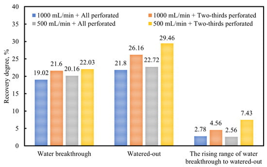 It can be seen from Figure 13 that selecting a gas production rate of 1000 mL/min when the layer is all perforated is not conducive to gas recovery in the profile model, and the recovery degree of water breakthrough and watering-out is relatively low. This is because the sandstone has hydrophilic properties. After the edge water invades, the reservoir rock adsorbs water and shrinks the gas seepage channel. A gas production rate of 1000 mL/min and a perforated layer will accelerate the migration speed of the gas–water interface so that edge water can quickly invade the production end, which is more likely to cause water seal and water lock. In addition, the premature invasion of edge water will increase water saturation in the gas reservoir, thus reducing the relative permeability of natural gas. The water and gas also gradually change from single-phase to two-phase flow, increasing gas phase seepage resistance and reducing the gas reservoir’s stable production capacity and recovery rate. Therefore, when the layer is all perforated, and the gas production rate is set to 1000 mL/min, the recovery degree of the gas reservoir is only 19.02% when water breakthrough occurs. In addition, with a gas production rate of 1000 mL/min and the layer perforated, the water production rate rises faster after the water breakthrough, and the gas reservoir will quickly reach the state of being watered-out. Under the premise that the gas production rate is 500 mL/min, the recovery rate of the model with the layer all perforated from water breakthrough to watering-out is only 2.56%. In contrast, the recovery degree of the model with the layer perforated two-thirds can be increased to 7.43%, a difference of a factor of 2.9. Therefore, for the F layer of an X gas reservoir, the recommended layer is only perforated to the upper two-thirds part.