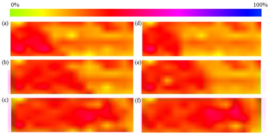 The saturation test probe was used to scan the profile model regularly during the experiment. The real-time saturation distribution of the gas–water two-phase flow of the profile model was obtained, as shown in Figure 14, and the invasion direction of the edge water was from left to right. As the existing saturation-testing principle on the large-scale physical model is mostly direct current logging, the probe or electrode must be in direct contact with the rock slab to perform signal acquisition, which results in reducing the degree of sealing of the rock slab, and point-to-point will bring about a large number of signal leads, which have to be led out from the external model under high-temperature and high-pressure conditions, which greatly increases the risk of leakage [42]. Compared to other scholars’ research on water invasion, we can visually observe the real-time distribution of gas–water saturation and the movement of the gas–water interface under high pressure (37 MPa) using a resistivity scanning device. This is a significant advantage of this study, as it does not affect the internal fluid seepage of the model and can monitor the fluid seepage state under formation pressure, providing insights for future researchers studying water intrusion and gas–water migration patterns.