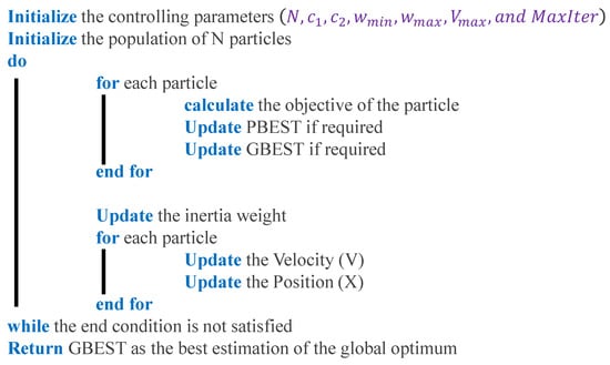 where N: the number of particles; v i t + 1 = the velocity of i t h particle at ( t + 1 ) t h iteration; w : the inertia weight of the particle; v i t = the velocity of i t h particle at t t h iteration; c 1 , c 2 : the acceleration coefficients for exploitation and exploration; r 1 , r 2 = randomly generated binary numbers; P B E S T : the best position of the i t h   particle obtained based upon its own experience, gbest; G B E S T : global best position of the communicated particles in the population; x i t = the position of the i t h particle at the t t h iteration; w m a x   a n d   w m i n : maximum and minimum values of inertia weight; MaxIter: maximum number of iterations.