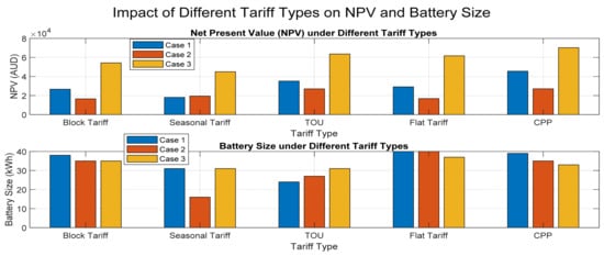 Figure 11. Impact of different tariff structures on NPV and battery size.