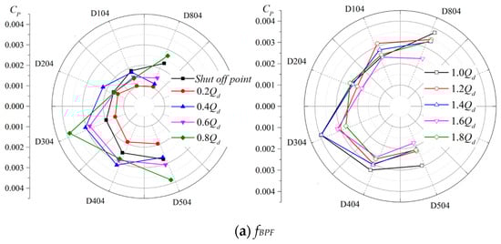 The distribution of pressure pulsation amplitudes at the blade passing frequency (fBPF) at various measurement points under various operating conditions is depicted in Figure 7a. It can be observed that the amplitudes of fBPF at different measurement points showed no significant regularities under different operating conditions. In the same operating condition, the distribution of fBPF amplitudes is extremely asymmetrical in the circumferential direction. At the 0.2 Qd operating condition, the fBPF amplitude is the smallest at all measurement points, while at the 1.0 Qd operating condition, except for the D104 measurement point, the fBPF amplitude is the largest at the remaining measurement points. In all operating conditions, the D304 measurement point exhibits a peak in the fBPF amplitude, while the D504 measurement point has the smallest fBPF amplitude.
