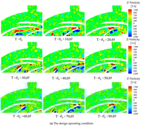 Figure 14a displays the distribution of vortex structures in region A2 under the design operating condition. It can be observed that the evolution of vortex structures in the impeller and guide vanes in region A2 follows a similar pattern as in region A1. The positive vortex experiences interference with the guiding vanes (at at T = θ0 + 10Δθ), causing squeezing and shearing as well as an increase in vortex energy after shedding from the trailing edge of the blade. Then, the vortex structures continue to shed and dissipate (at T = θ0 + 30Δθ). As the impeller rotates, the vortex structures exhibit periodic evolution. Positive and negative vortex structures alternate inside the volute chamber, flowing downstream and dissipating. The distribution of vortex formations in region A2 under various operation circumstances is displayed in Figure 14b. There are significant differences in the distribution and energy of vortex structures in region A2 under different operating conditions. Under the design operating condition, the vortex structures in the impeller passage are small and low in energy, and the wake vortices shed from the impeller exit dissipate after interacting with the guide vane blades. There are more high-energy vortex structures in the guide vanes and the volute chamber, resulting in a turbulent flow field. As the flow rate increases, the vortex structures in the impeller passage gradually attach to the pressure and suction sides of the entire blade, the energy of the wake vortices at the impeller exit significantly increases, and they periodically shed over time. The vortex structures in the guide vanes and the volute chamber disappear, resulting in a more uniform flow field, and the flow becomes more stable.