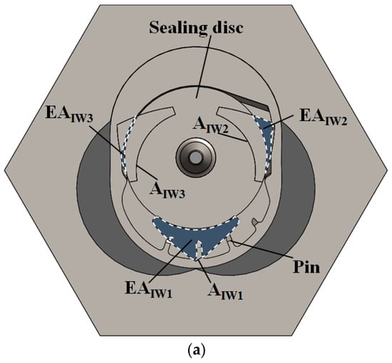 Figure 8 shows the effective area (EA) of IW·EW versus the SRA of the experimental engine when applying the step 3 and 4 models. Figure 8a shows the EAIW when SRA = 0°, with three fixed windows at 120° intervals, but the effective area EAIW (shaded area) directly contacts the IC as the rotor rotates. Figure 8b shows EAIW changes in the intake window versus the SRA. The effective area (EAIW1) is first obtained (dotted line) using a design drawing for one window (IW1). The areas of the three windows are then summed considering the changes in EAIW2 and EAIW3 in the same manner as that of EAIW1, maintaining 240° (SRA) phase difference. Figure 8c shows the EAEW (solid line) changes versus the SRA. Similar to the case shown in Figure 8b, the EAEW1 of one window (dotted line) is obtained and the areas of the three windows are summed considering their phase differences.