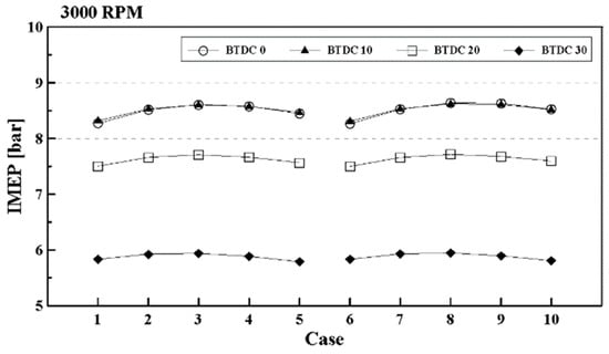 Figure 18 shows a simple optimization to select the main cases for analysis, with the combustion rate of a typical reciprocating engine Wiebe combustion model and 3000 RPM. The maximum indicated mean effective pressure (IMEP) is achieved at SoI −50° and SoE 500° (Figure 18, ★), and the starting points of the intake and exhaust port are located between SoI −60° and −50° and SoE 480° and 520°, respectively, confirming the good performance of the IMEP. The thermal efficiency did not change significantly based on the intake and exhaust port locations, and hence is not included in Figure 18. Therefore, the main analyses were selected as 10 cases between SoI −60° to −50° and SoE 480° to 520° based on IMEP. The start angles of the intake and exhaust ports of the selected cases are shown in Table 5. It shows that cases 1 to 5 have SoI −50°, whereas cases 6 to 10 have SoI −60°, and SoE reduces as the case number increases.