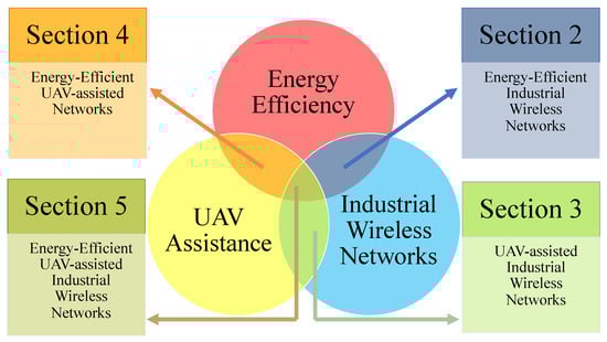 The structure and main concepts of the paper are shown in Figure 1 for clarity. The three main parts of energy-efficient UAV-assisted industrial wireless networks are “Energy Efficiency”, “Industrial Wireless Networks”, and “UAV Assistance”. Consequently, Section 2 identifies the combination of energy efficiency and industrial wireless networks. Section 3 introduces performance enhancements of industrial wireless networks with UAVs’ assistance. Next, the combination of energy efficiency and UAV communication networks is discussed in Section 4, followed by the analysis of energy-efficient UAV-assisted industrial wireless network provided in Section 5.