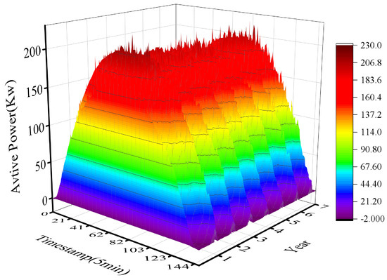 In this paper, the experiment dataset comes from the 1A PV power generation system at the DKASC Alice Springs in Australia. The description of the measurement equipment is shown in Table 1. The data interval is selected from 0:00 a.m. on 1 April 2016 to 11:55 p.m. on 31 March 2023, which spans about seven years, and the time step is 5 min. Each piece of data contains real-time measured power plant data and meteorological data such as temperature, weather relative humidity, global and diffuse horizontal radiation, current phase average, wind speed, wind direction, active power, and weather daily rainfall. These data are used to train and test the proposed model. The temporal resolution in this paper is set to 5 min. The PV active power profile of DKASC is shown in Figure 2.
