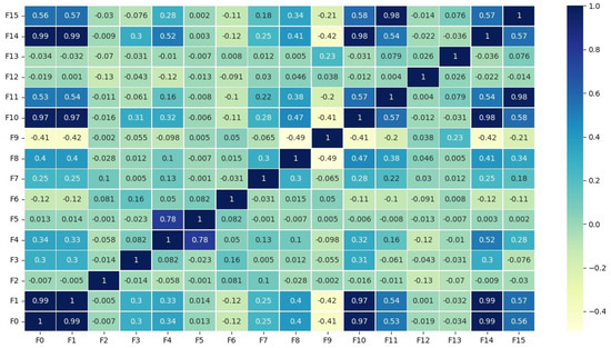 There are 16 features in the DKASC dataset, as shown in Table 2. Although they all affect the magnitude of PV output power to a certain extent, the degree of effect is different. In this regard, this paper calculates the Pearson coefficients of the 16 features with each other and uses the Pearson coefficients to categorize all the features and search for those that show a high correlation with PV active power among them to input into the model. The results are shown in Figure 3. It can be seen from Figure 3 that the values of the Pearson coefficients between the three features, namely, the current phase average, the global horizontal radiation and the radiation global tilted, and the output power of PV are as high as 0.99, 0.97 and 0.99, which present highly positive correlation characteristics. Therefore, the above three features and the PV output power itself are selected as the input features of the prediction model.