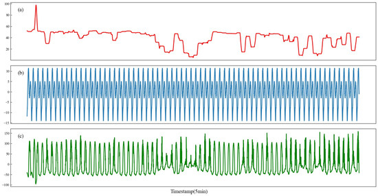 where A and X represent the output and input vector sets of the attention mechanism, respectively. N represents the number of vector sets, and represents the correlation score or energy associated with the th input vector , which determines how much importance the model attaches to that vector. represents the time series of the input data. is the specified period of attention, which implies that the model will focus on finding the relationship between the data at the same time points in different periods. It needs to be computed based on the time step of the data and its potential periodicity. For example, in this paper, the time step of the dataset is 5 min, and if we need to focus on the periodicity within a day, we need to set to 288.
